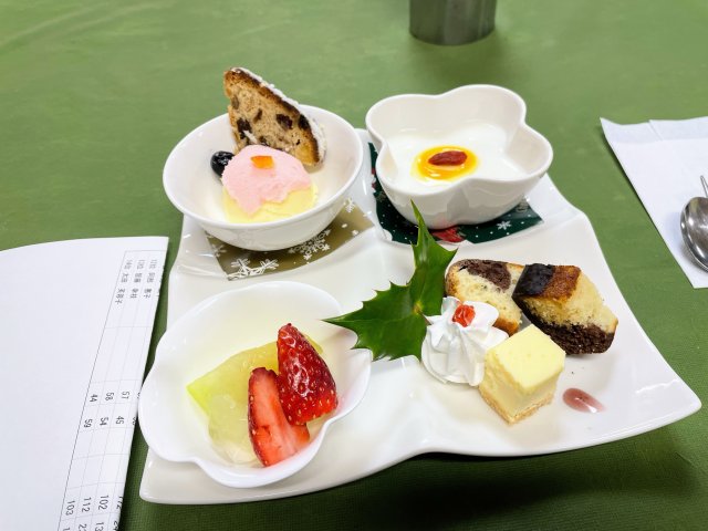 パーティーでは、会長さんがシェフにお願いして下さったそうで、クリスマスらしい可愛らしいお菓子が出されました。皆さんで美味しく楽しく頂きました。