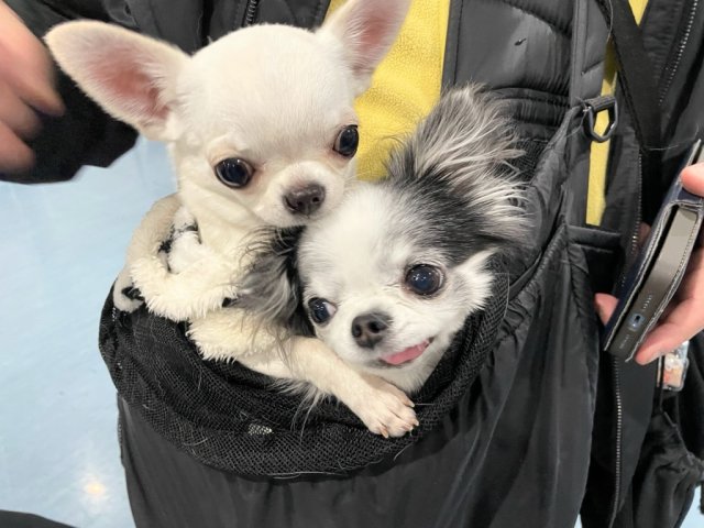 羽田で皆さんと解散したのですが、駐車場までご一緒した方は、ご主人が迎えにいらしてました。凄く可愛いチワワを2匹連れてのお迎えで、写真を撮らせていただきました。彼女の顔を見るなり、ご主人のドッグスリングから飛び出しそうでした。可愛いなぁ。