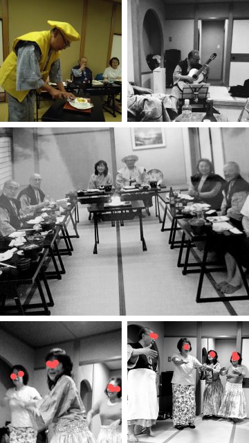 お酒が入らなくても、賑やかなのがmelon家の兄弟。食事が終わると、部屋に戻っての無礼講です。三男はボランティアで、介護施設や趣味の会などで、ギター演奏をしているので、高齢者が喜びそうな曲やギターの名曲等を聞かせてくれました。合気道を長年やっている長兄は、昔のお嬢さんたちに護身術を教えてくれました。妹はYouTubeで覚えた落語を披露、私と妹のフラダンスはドッキリだったので、一番受けました。アンコールの声に、兄達も混ざって、腰をフりフリ、手をユラユラさせて、盆踊りのようなフラダンスでした。