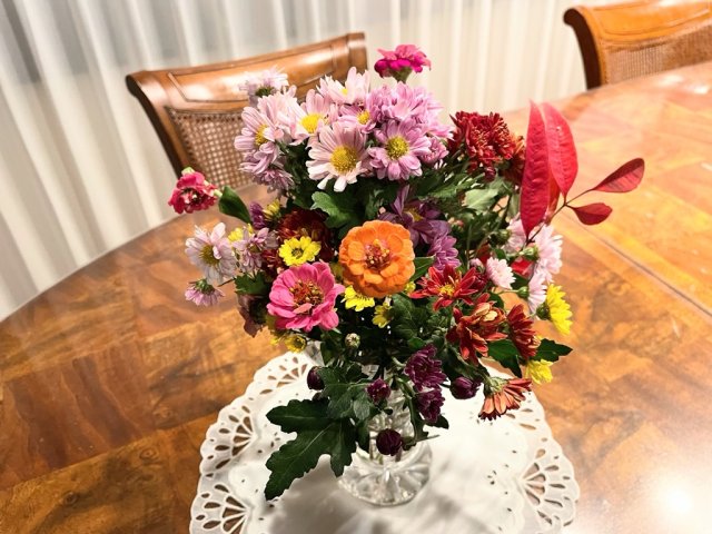 今日はYさんが来てくれました。私は昨日の食器類の片づけや、家計簿整理など細々とした家庭内事務仕事をしていました。そうこうしているうちに、いつもの友人がお花を届けてくれました。