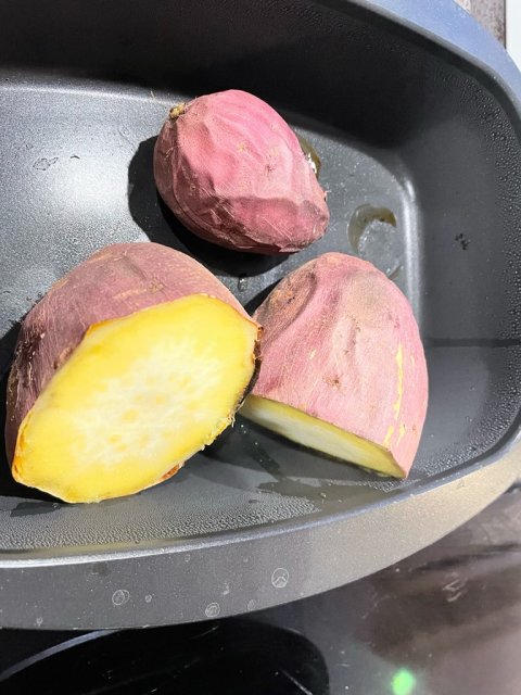 帰宅して、昨日千恵子さんからいただいたサツマ芋をダッチオーブンで焼いて、焼き芋を作りました。アキロイ君が裏庭で栽培したものだそうです。