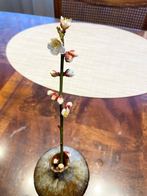 テーブルに飾った1輪挿しの梅が開き始めました。これだけで良い香りがします。