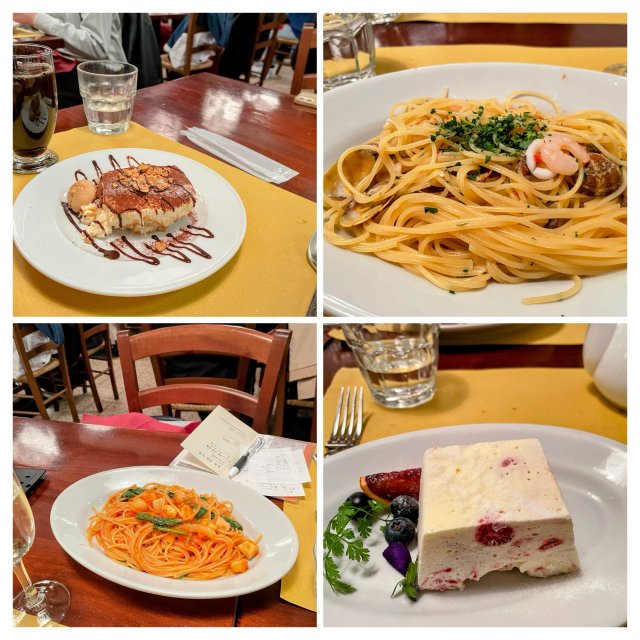 ヴェネチア伝統のバーカロスタイルのお店だそうです。どれもみんな美味しかったけれど、前菜のイカ墨が特に気に入りました。デザートも美味しかった。三男が頼んだティラミスは大当たりだったようです。ニコニコして食べていました。